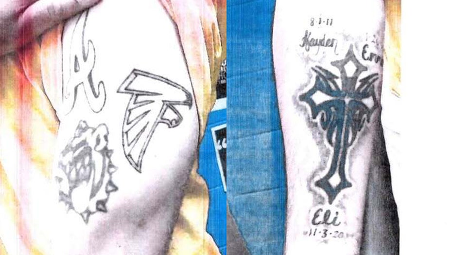 Photos released by the sheriff's office showed logos of three Georgia sports teams on one of his biceps, including the Atlanta Braves "A" logo, the Falcons logo, and a Bulldog. His other arm features a stylized Gothic or ornamental tribal cross that appears to pay tribute to family members or friends who have died.
