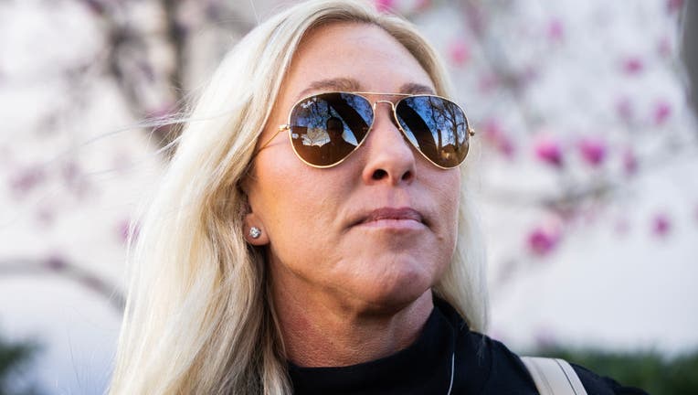 UNITED STATES - MARCH 25: Rep. Marjorie Taylor Greene, R-Ga., leaves the Capitol Hill Club after a meeting of the House Republican Conference on Tuesday, March 25, 2025. (Tom Williams/CQ-Roll Call, Inc via Getty Images)