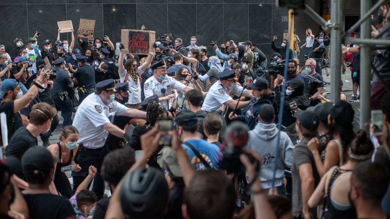 FILE - People clash with police as they take part in a protest on Foley Square in front of the Manhattan courts on May 29, 2020 in New York. (Photo by Stephen Ferry/VIEWpress via Getty Images)
