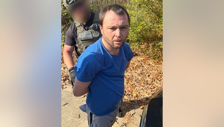 A U.S. Marshals team and Stephens County investigators take Michigan fugitive Kyle Alband into custody in Walhalla, South Carolina, after a multi-state search. The officer’s face was already blurred when the image was provided. The arrest happened No