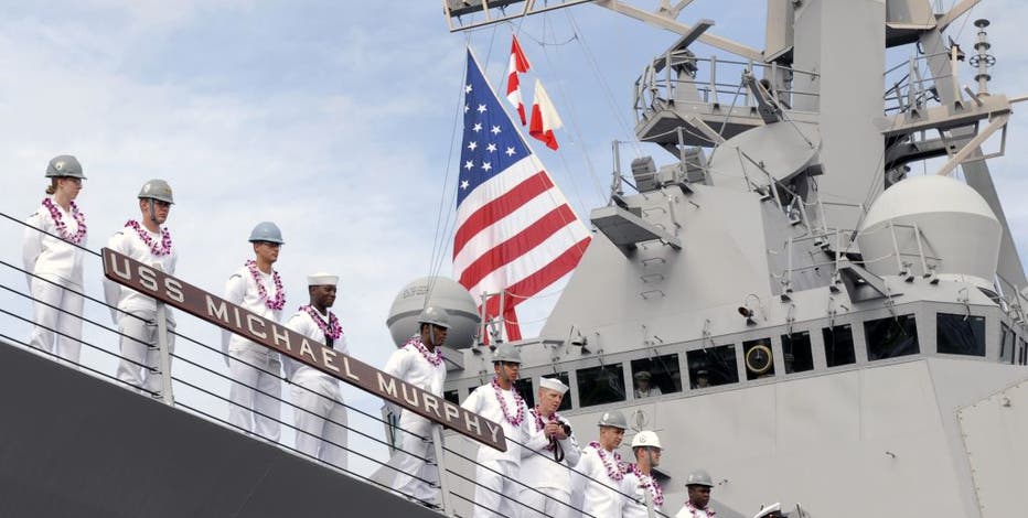 FILE - Sailors aboard the guided-missile destroyer USS Michael Murphy man the rails as the ship arrives at its homeport of Joint Base Pearl Harbor-Hickam for the first time, November 21, 2012. (Smith Collection/Gado/Getty Images)