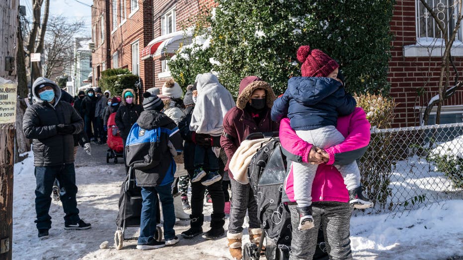 New York Cares volunteers distribute holidays toys and winter coats on Dec. 19, 2020 in Queens, New York. The line of people stretched seven blocks. (Photo by Lev Radin/Pacific Press/LightRocket via Getty Images)