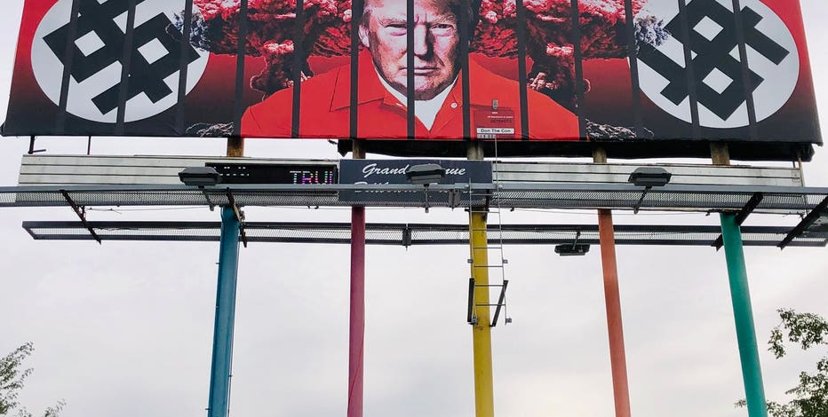 The anti-Trump billboard is located along Grand Avenue near 11th Avenue. There’s also a ticker below it, displaying the increasing number of COVID-19 deaths in the U.S.