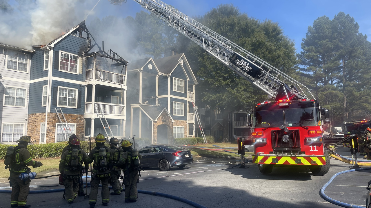 Firefighters responded to the Reserve at Gwinnett Apartments in the 1700 block of Graves Road NW around 2:45 p.m. after a 911 caller reported seeing flames coming through the roof.