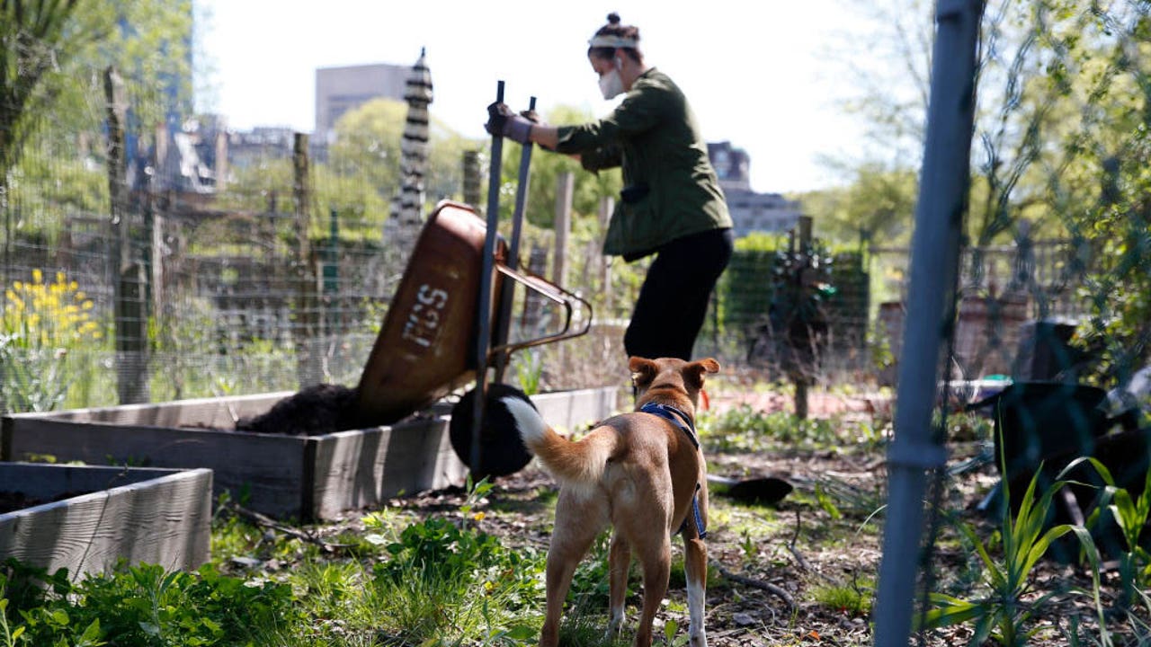 FILE IMAGE - A woman puts compost into the garden beds as she tends to her plot in the Fenway Victory Gardens in Boston on May 20, 2020. (Photo by Jessica Rinaldi/The Boston Globe via Getty Images)