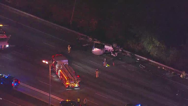 SKYFOX 5 flew over the interstate and saw the overturned truck and multiple firefighters and police officers on the scene.
