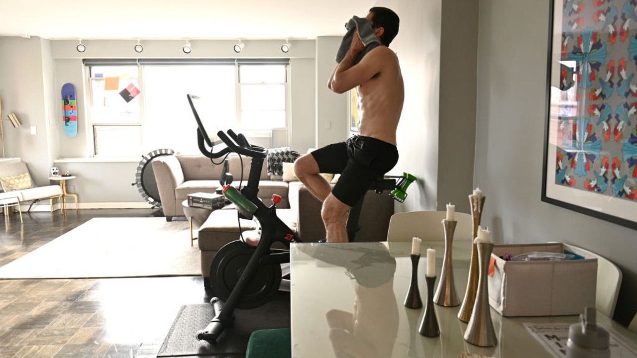 FILE - A person works out on a Peloton high-tech stationary bike in his apartment on May 18, 2020, in New York City. (Photo by Michael Loccisano/Getty Images)