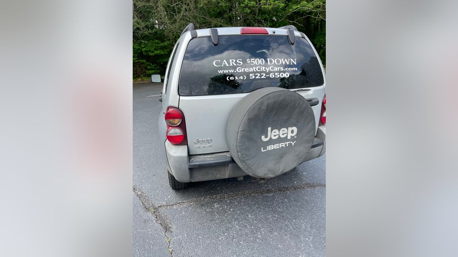 The suspect's vehicle is a gray or silver Jeep Liberty with a decal on the back that read "Cars $500 Down www.GreatCityCars.com (614) 522-6500."