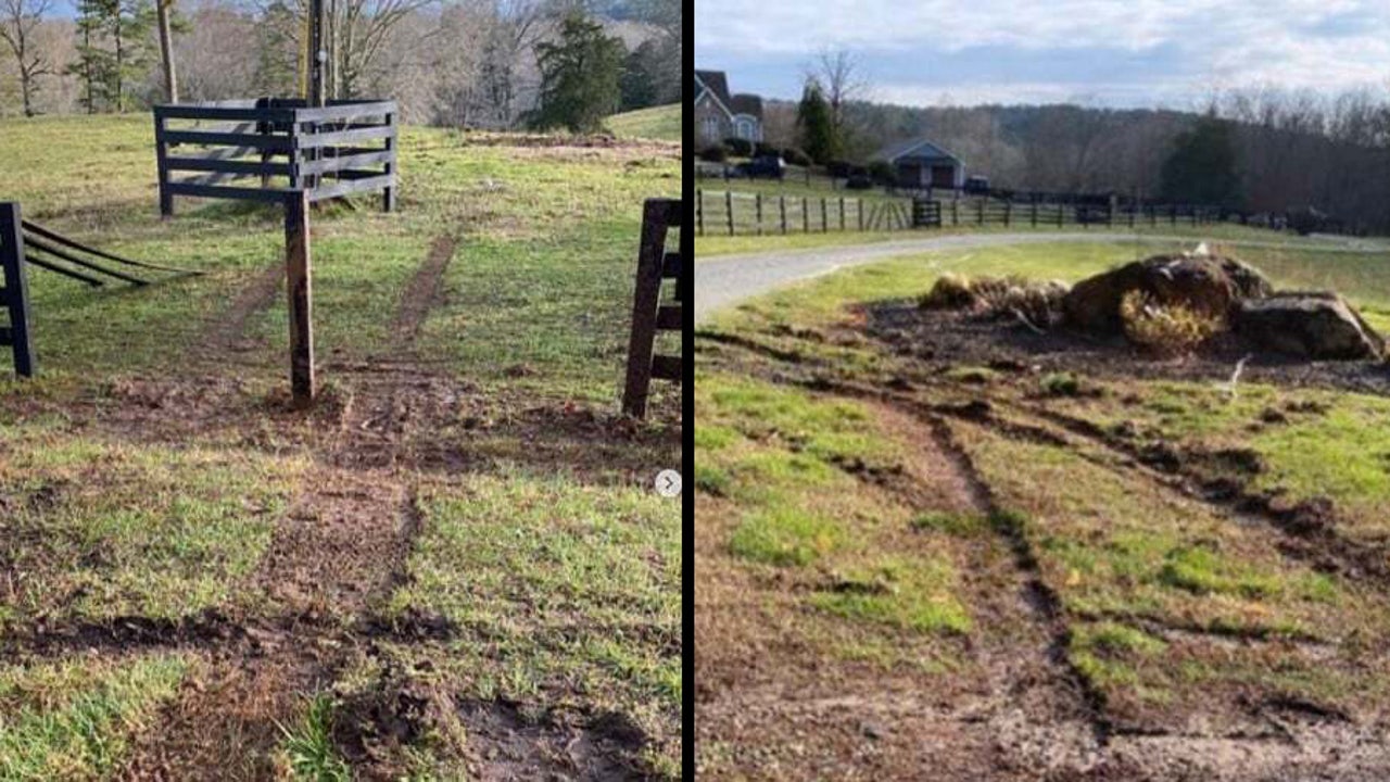 The Hall County Sheriff's Office shared images of property off of North Browning Bridge Road with deep tire tread marks. Investigators think the damage happened between 1 a.m. and 5 a.m. on March 19. (FOX 5 Atlanta)