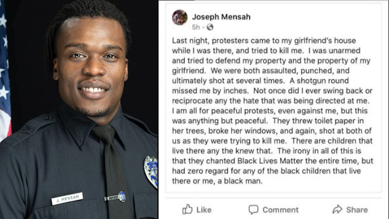 "Last night, approximately 50 people assembled at the private residence of Wauwatosa Police Officer Joseph Mensah, engaged in a protest, and began to vandalize his home. Officer Mensah tried to engage in a dialogue with them but was physically assaulted. As he retreated into his home, armed protesters approached the rear door and one fired a shotgun round into his back door. The Wauwatosa Police Department received assistance in dispersing the crowd from numerous neighboring agencies. The WPD’s investigation into this incident is ongoing.
