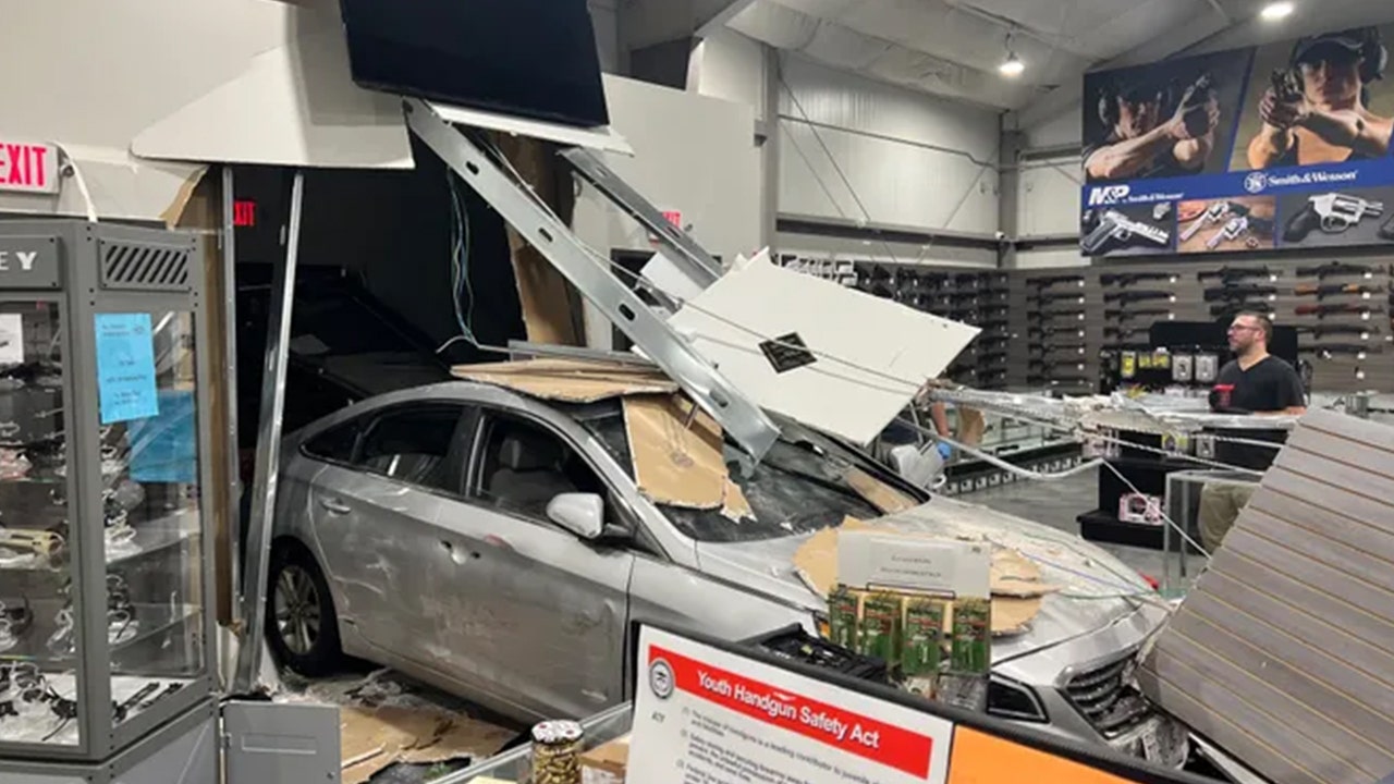A security camera captured the moment a juvenile driver slammed a stolen car through the steel doors at Osage County Guns in Wright City, Missouri. (Credit: Osage County Guns / Fox News)