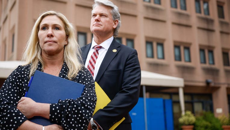 Rep. Marjorie Taylor Greene (R-GA) and Rep. Mike Collins (R-GA) are seen outside as the Congressional Integrity Project video truck showing 12 minutes of footage from the January 6th Insurrection drives around the DC Department of Corrections on Marc