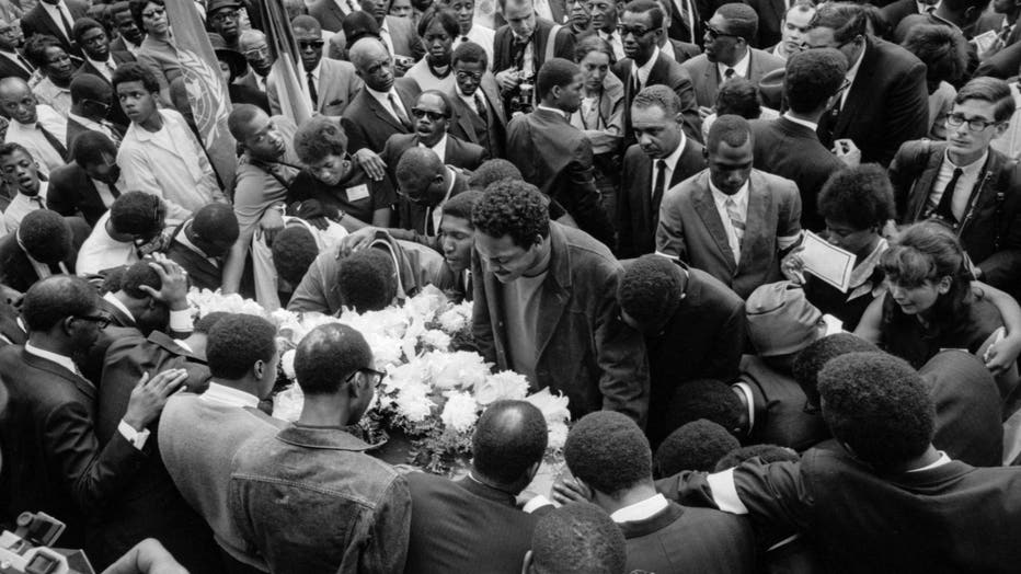 Reverend Jesse Jackson stands over the coffin of Rev. Martin Luther King, Jr. in Atlanta in 1968.