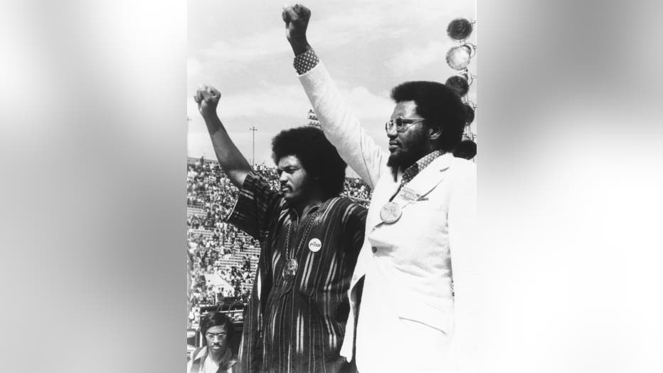 American political activist Jesse Jackson (left) and Al Bell, co-owner of Stax Records, giving a clenched fist salute at the Wattstax music festival, Los Angeles, California, on August 20, 1972.
