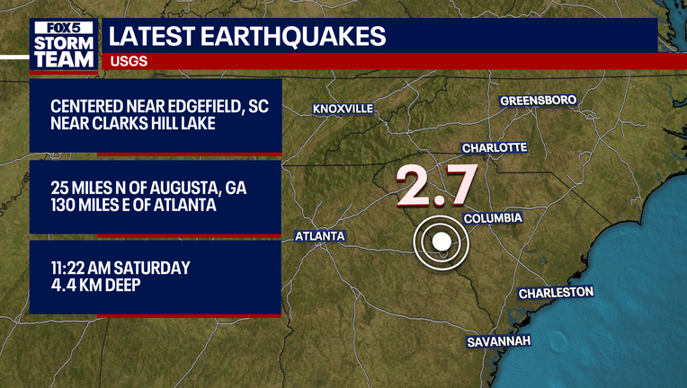 EDGEFIELD, S.C. - A 2.7-magnitude earthquake hit just over the Georgia--South Carolina state line Saturday morning.