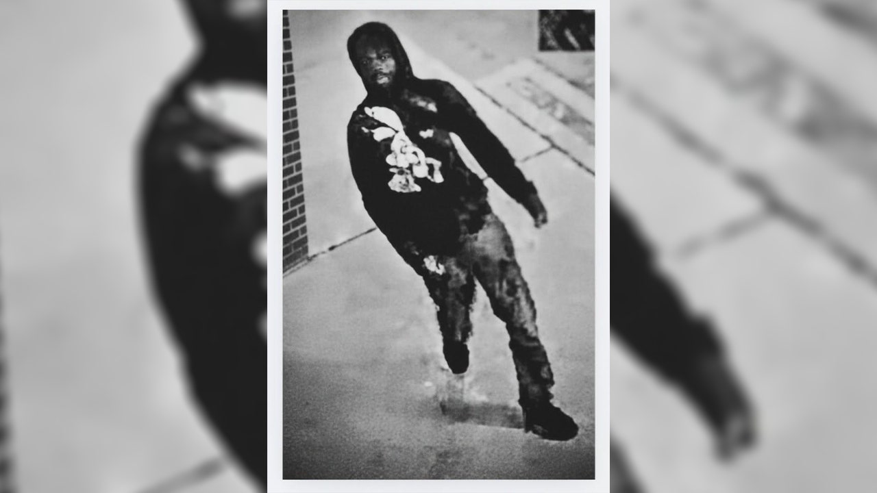 A Savannah Police Department surveillance image shows a man wearing a dark hooded sweatshirt with a large graphic on the front and dark pants as investigators seek information in a chemical attack at Forsyth Park in Savannah on December 10, 2025. (Sa