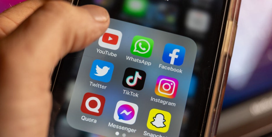 FILE - In this photo illustration, the logos of TikTok, YouTube, instant messaging software Whatsapp Facebook, Twitter, Instagram, Quora, Facebook Messenger and Snapchat are pictured on March 16, 2023. (Photo by Matt Cardy/Getty Images)