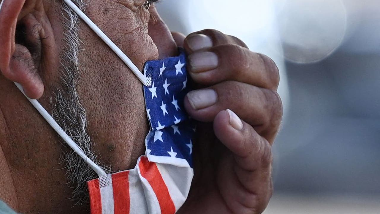 A man adjusts his American flag face mask on July 19, 2021, on a street in Hollywood, California, on the second day of the return of the indoor mask mandate in Los Angeles County due to a spike in coronavirus cases. (Photo by ROBYN BECK/AFP via Getty
