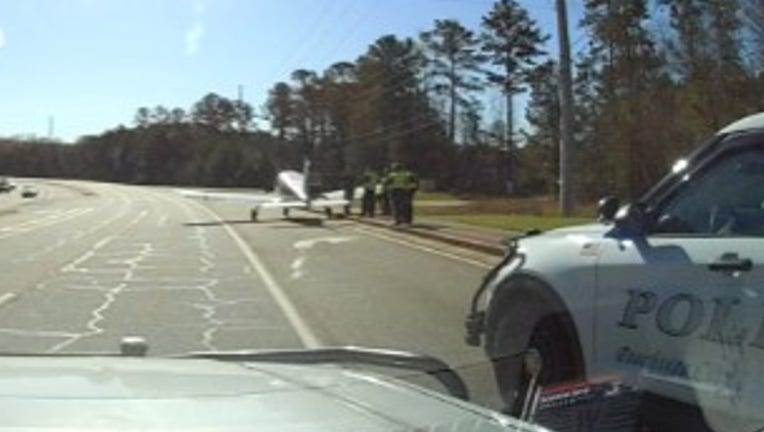 A small plane made an emergency landing on Highway 74 in Peachtree City Friday morning, according to police. (Peachtree City Police Department)