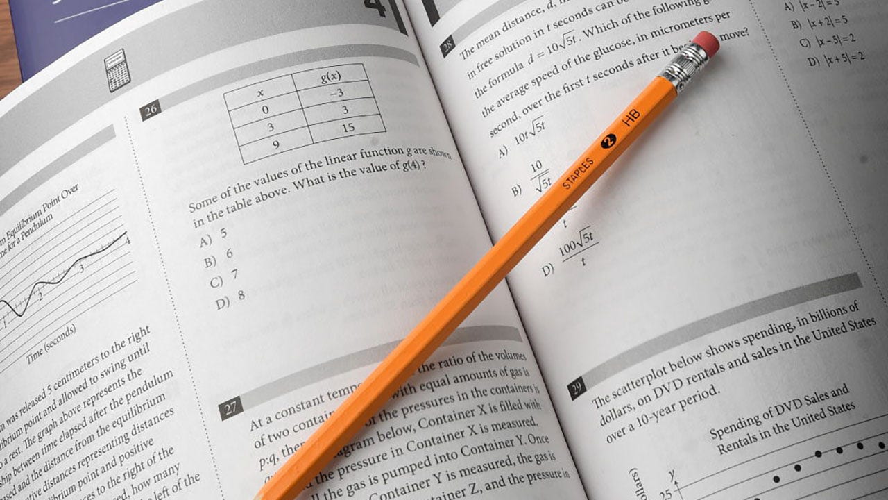 FILE - Close-up of a pencil on a page of an SAT college entrance exam preparation book, taken on August, 6, 2017, in Melville, New York. (Photo by Thomas A. Ferrara/Newsday RM via Getty Images)