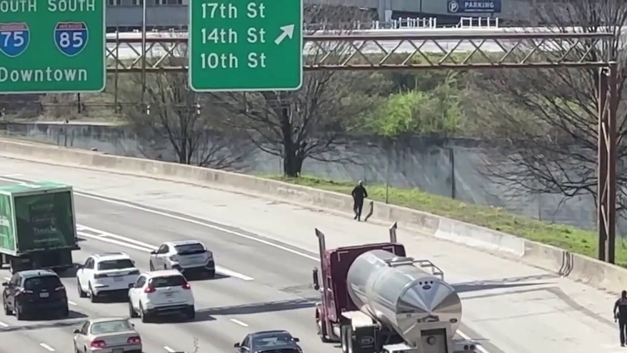 The suspect, described as wearing a white shirt, was seen leaping over guardrails near the I-85/75 southbound connector before being tackled and taken into custody by APD. Authorities indicate the suspect was transported to a local hospital under guard following the arrest.