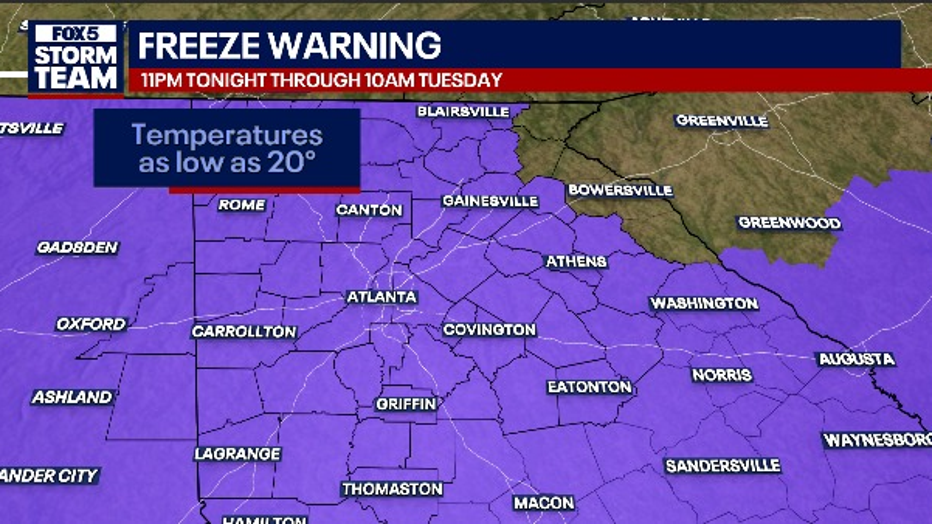 The FOX 5 Storm Team is also monitoring the potential for light snow showers or flurries to develop in North Georgia by Monday afternoon. While the warm ground is expected to prevent significant accumulation, a light dusting is possible in higher elevations. Looking ahead, a Freeze Warning is set to take effect at 11:00 p.m. tonight, with temperatures expected to drop into the widespread 20s by Tuesday morning.
