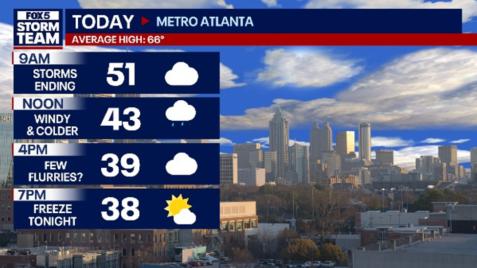 As the storm line exits toward Athens by mid-morning, a "tremendous shock" awaits behind it. A powerful blast of cold air is expected to replace the morning humidity, dropping afternoon temperatures into the 40s. The shift is so aggressive that moisture on the back end of the system could briefly turn into light snow or flurries in far North Georgia and the north metro suburbs.