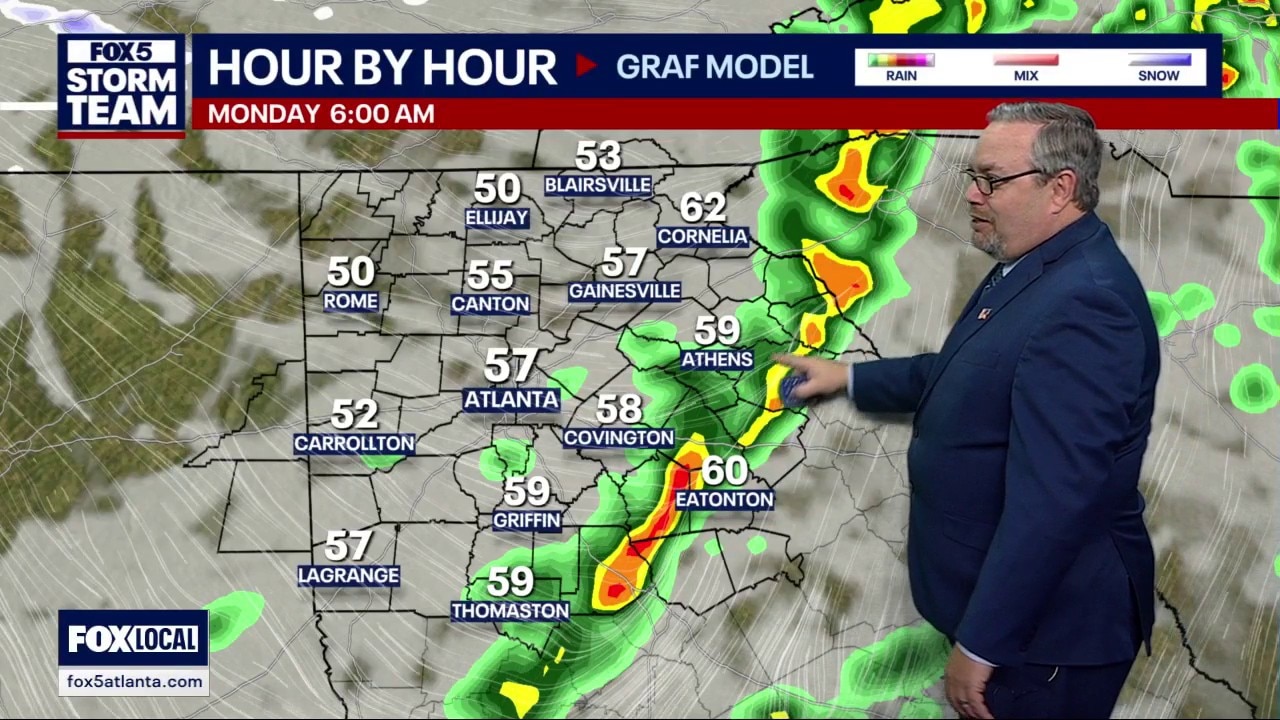 - Monday (around 1 a.m.): The main line of severe storms enters Northwest Georgia, moving out of the area around 8 a.m. "It's not going to storm at your house that entire time, instead it will likely only be about 30-minutes in that window of time," Forbes said.