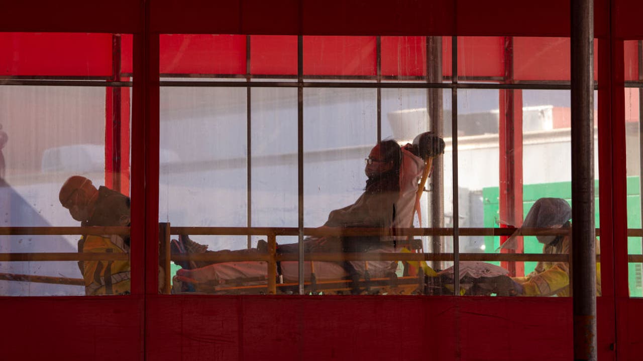 An Emergency Medical Team from a Long Island hospital take in a patient to the emergency room of the Elmhurst Hospital Center on April 06, 2020 in the Queens borough of New York City. (Photo by Robert Nickelsberg/Getty Images)