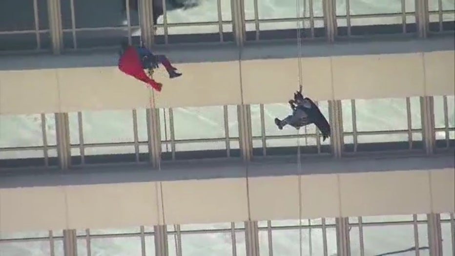 Ironman, Batman and Superman rappel down the MD Anderson Cancer Center building.