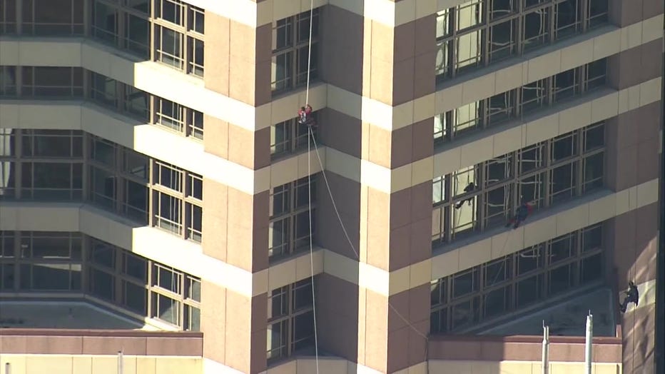 In true super hero fashion, they rappelled down the towering building waving into the windows.