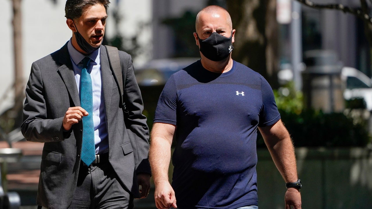James Theodore Highhouse, right, arrives for his sentencing hearing at U.S. District Court with his attorney Jaime Dorenbaum, left, in Oakland, Calif., Wednesday, Aug. 31, 2022. Highhouse pleaded guilty to sexually abusing an inmate while working as