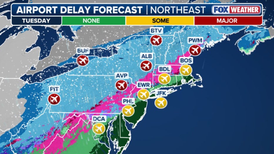 While temperatures will likely be too warm for snow along the coast, periods of heavy rain Tuesday could cause travel delays at airports in Washington, D.C., Philadelphia, Newark, New Jersey, New York City and Boston.