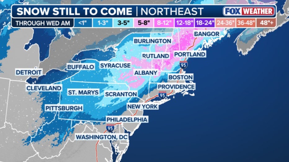 The effects of the snow will be amplified across higher elevations, including parts of the Adirondacks, Green and White mountain ranges through Wednesday morning.