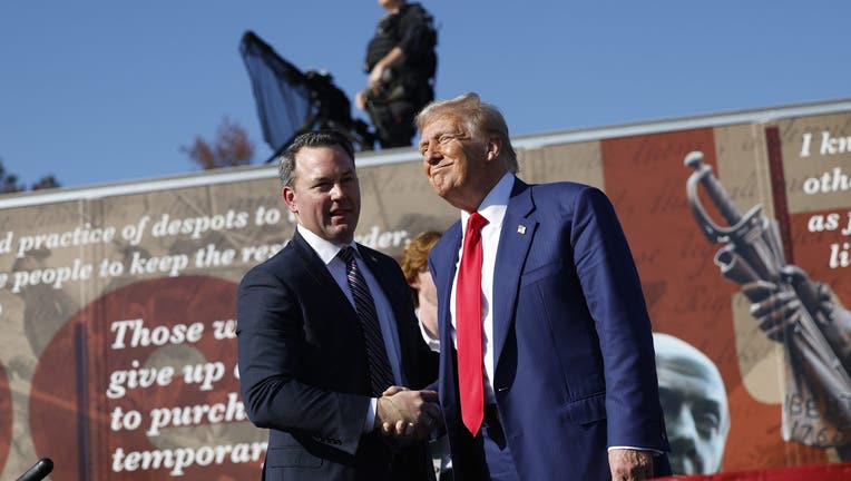 President Donald Trump shakes hands with Georgia Lt. Gov. Burt Jones as he addresses an overflow crowd while departing a roundtable discussion with faith leaders at Christ Chapel during his reelection bid on Oct. 23, 2024 in Zebulon, Georgia. (Photo