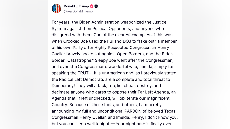 President Trump pardons Texas Democrat Rep. Cuellar for federal charges