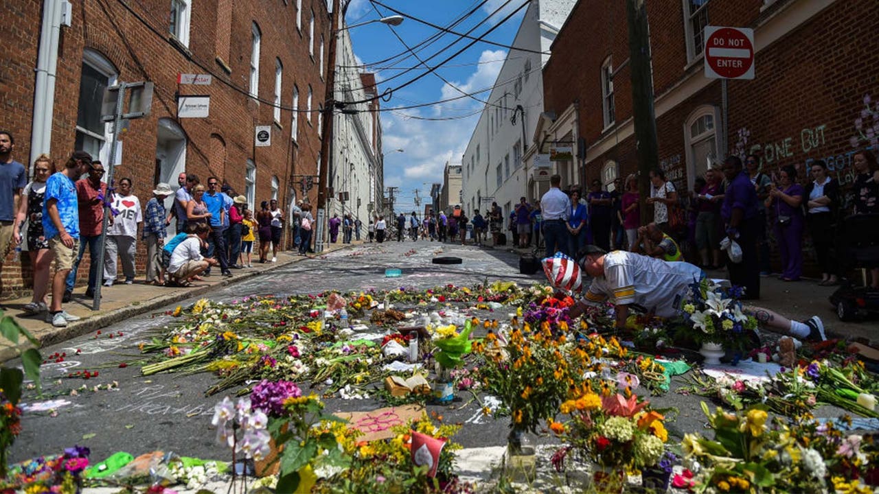 FILE - People gather at a memorial for Heather Heyer after her funeral service on Wednesday, Aug. 116, 2017, in Charlottesville, VA. (Salwan Georges/The Washington Post via Getty Images)