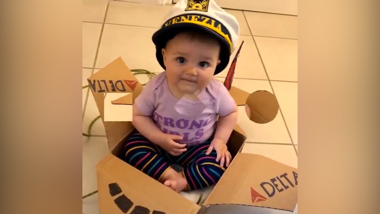 The video shows baby Stevie in a makeshift cardboard airplane with the words “Delta” written in marker on the wings.