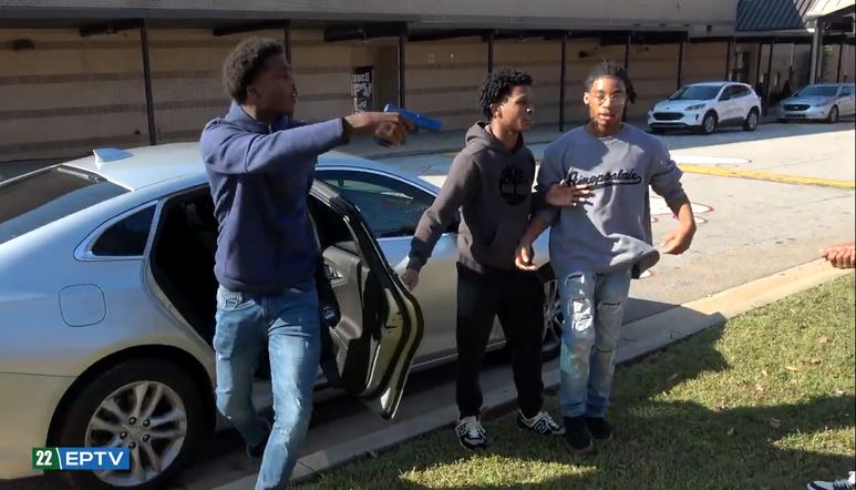 The video shows two teen boys approached by a group of three girls. The boys ask the girls if they'd like a ride to a party. When the girls seem interested, a third boy jumps out of the car with a gun, forcing them inside.