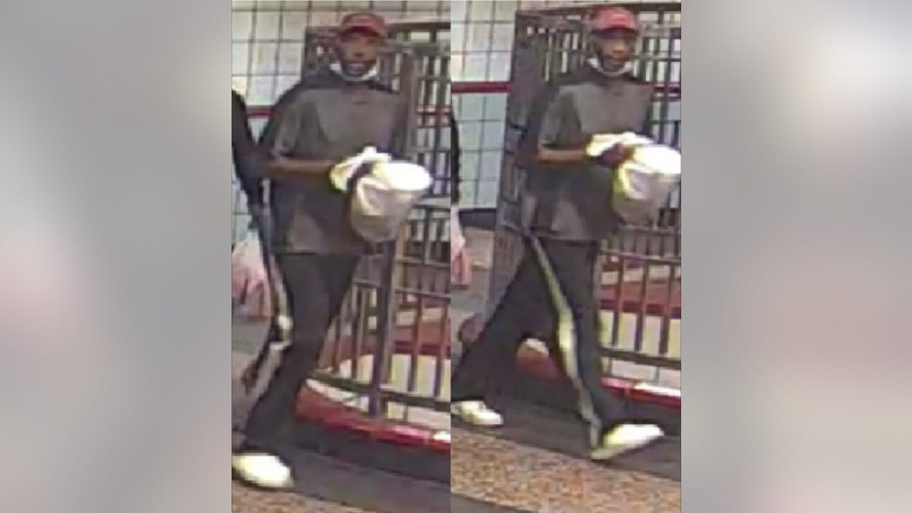 Police on Thursday released a photo of the suspect wearing a red hat, gray and black shirt, and white shoes.