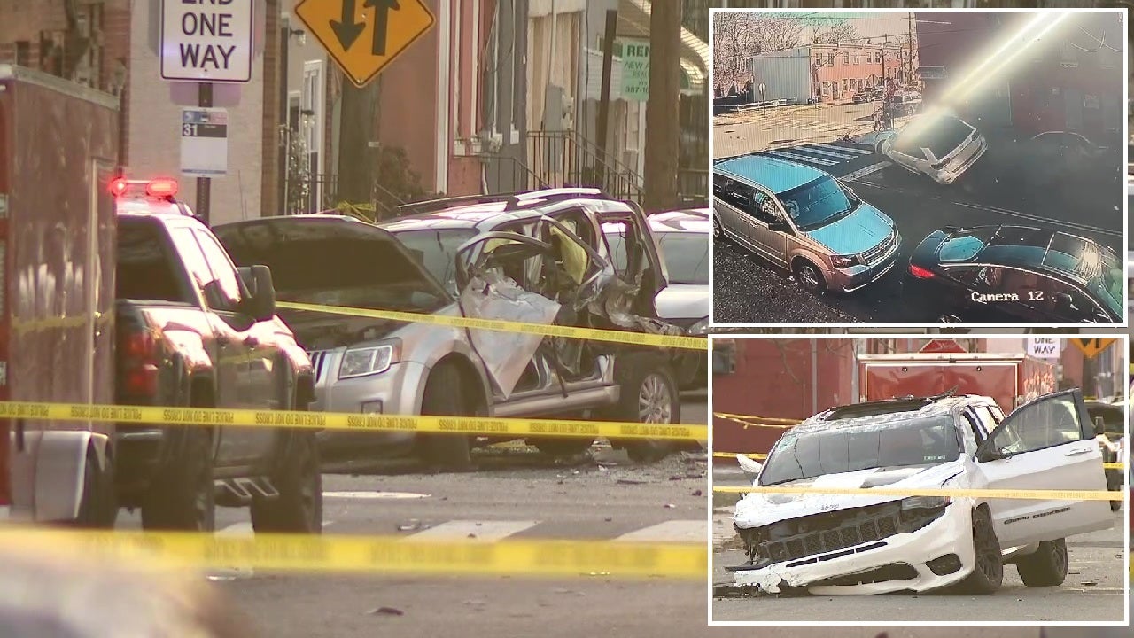 PHILADELPHIA - Shocking video shows a speeding stolen Jeep slam into a line of parked cars and tumble down a Philadelphia street Wednesday afternoon, leaving one person dead.