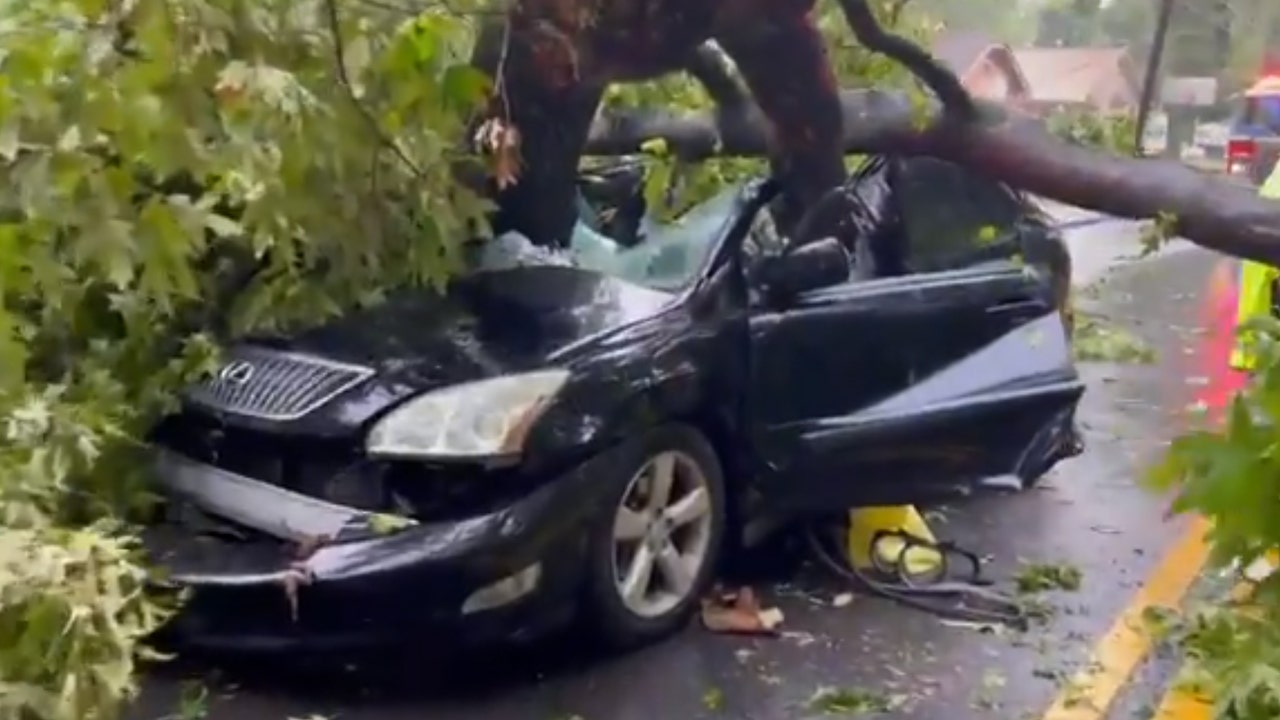 Video from the scene showed parts of the tree caved in the windshield and roof of a Lexus sedan.