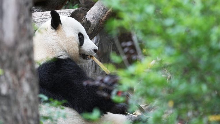 Giant panda Jie Bang eats bamboo at the Chengdu Research Base of Giant Panda Breeding on April 20, 2026 in Chengdu, Sichuan Province of China. (Photo by An Yuan/China News Service/VCG via Getty Images)