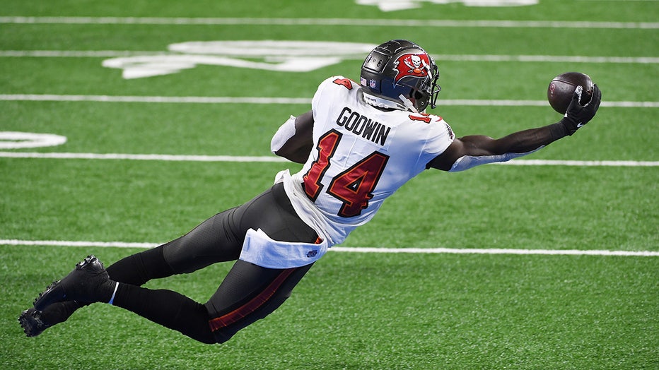 Chris Godwin of the Tampa Bay Buccaneers makes a seven-yard reception for a touchdown during the second quarter of a game against the Detroit Lions at Ford Field on December 26, 2020 in Detroit, Michigan. (Photo by Nic Antaya/Getty Images)