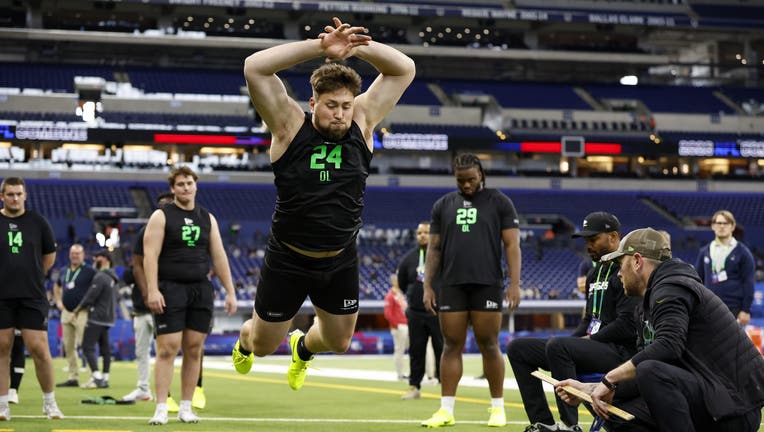 Monroe Freeling #OL24 of Georgia participates in the broad jump during the 2026 NFL Scouting Combine at Lucas Oil Stadium on March 1, 2026 in Indianapolis, Indiana. (Photo by Lauren Leigh Bacho/Getty Images)