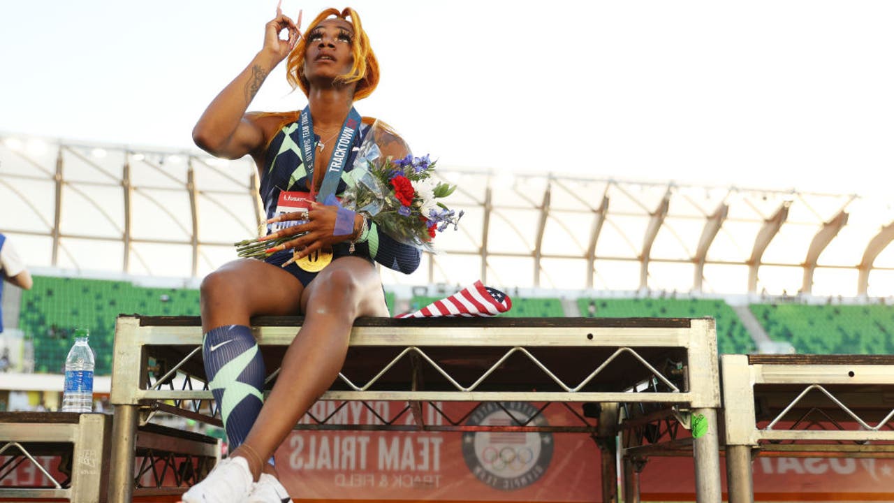 Sha'Carri Richardson celebrates winning the Women's 100 Meter final on day 2 of the 2020 U.S. Olympic Track & Field Team Trials at Hayward Field on June 19, 2021, in Eugene, Oregon. (Photo by Patrick Smith/Getty Images))