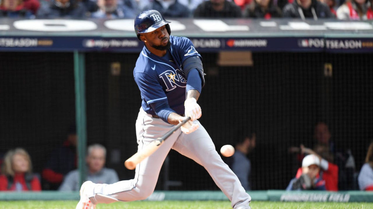 FILE - Randy Arozarena #56 of the Tampa Bay Rays bats during the fourth inning of game 2 of the wild card series against the Cleveland Guardians at Progressive Field on Oct. 8, 2022 in Cleveland, Ohio. (Photo by George Kubas/Diamond Images via Getty