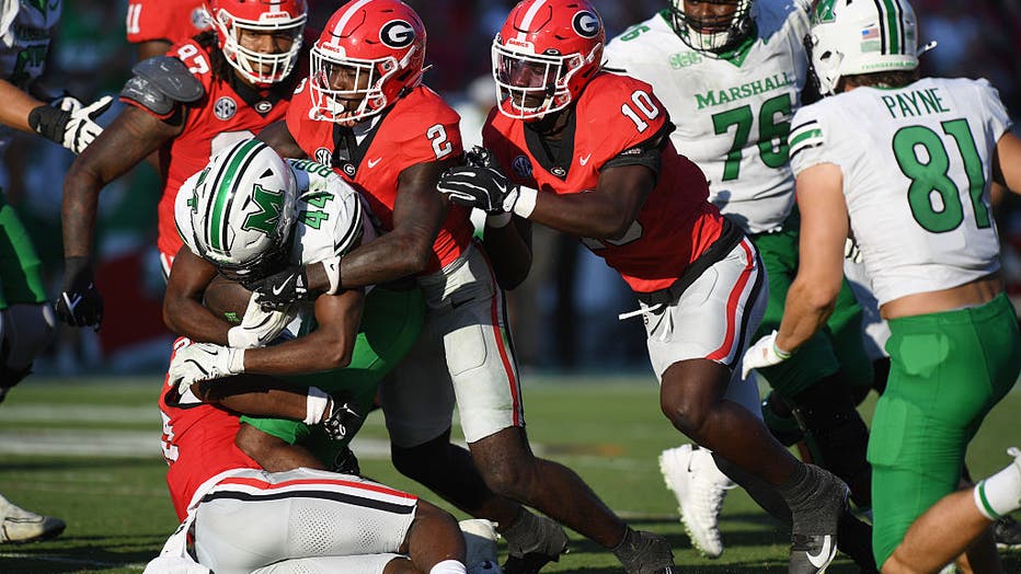 Zion Branch #2 of the Georgia Bulldogs tackles Antwan Roberts #44 of the Marshall Thundering Herd during the college football game between the Marshall Thundering Herd and the Georgia Bulldogs on August 30, 2025, at Sanford Stadium in Athens,GA. (Ph