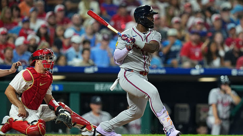 Michael Harris II #23 of the Atlanta Braves bats against the Philadelphia Phillies at Citizens Bank Park on August 31, 2025 in Philadelphia, Pennsylvania. The Braves defeated the Phillies 3-1. (Photo by Mitchell Leff/Getty Images)