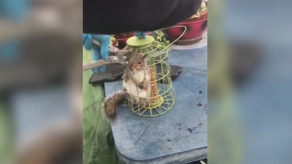 It was supposed to be feeding the birds, but instead a crafty squirrel got to the food inside and then got stuck. Thankfully, it was an easy fix.